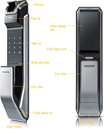 + Mở cửa bằng : Vân tay, mã số ( mật khẩu ), thẻ từ hoặc chìa cơ.